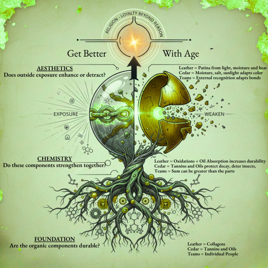 - The foundation for anything that gets better with age is driven by the organic components – the elements inside. Leather is simply collagen. Cedar contains tannins and oils. Teams are made up of individuals.