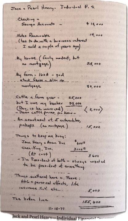 Jack Henry was profitable from Day 1. Co-Founders, Jack and Jerry, paid themselves a salary of $12,000, and funded all growth from their balance sheet. They drove to customers, worked until 3AM on installations, and then wokeup and drove to the next installation.